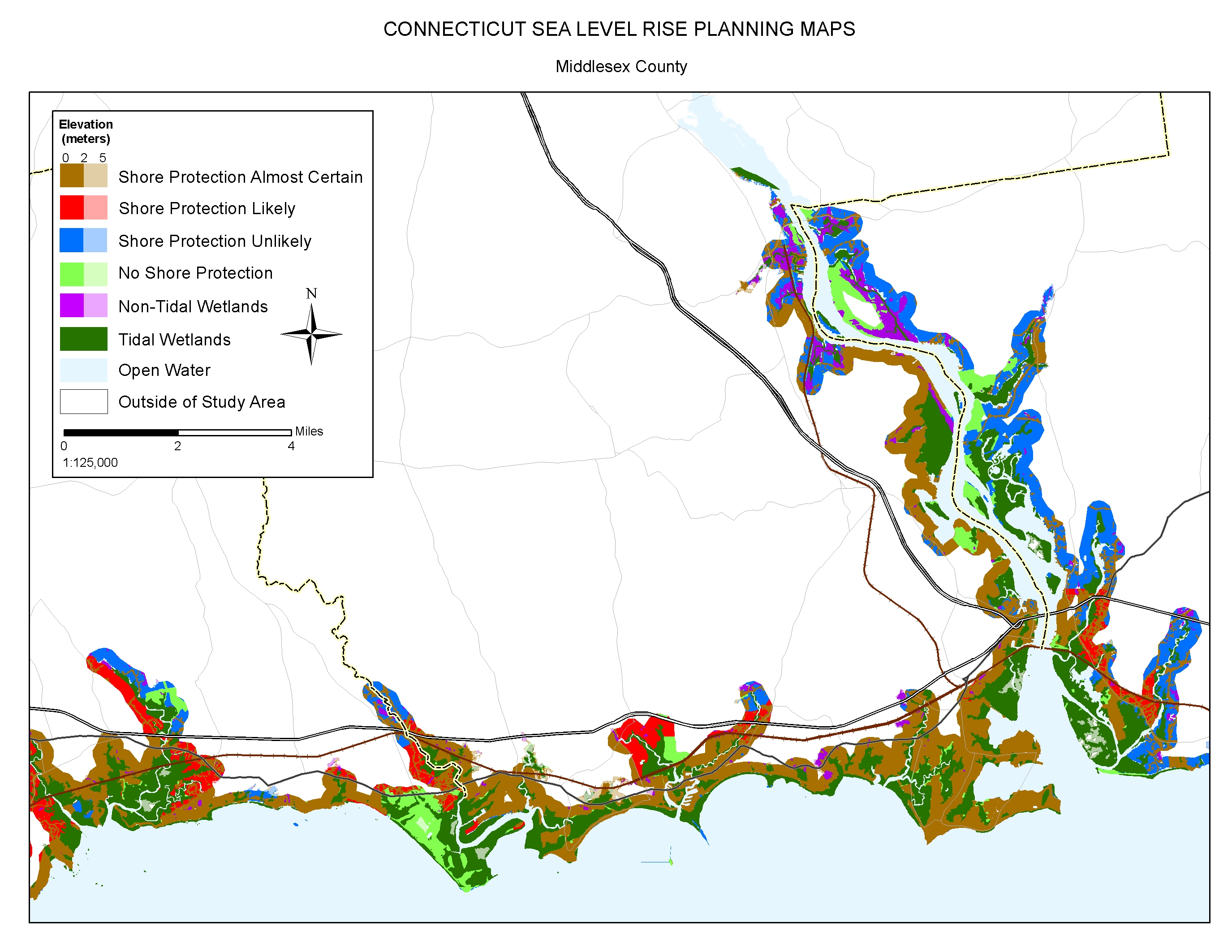 A $2 million effort to map the likelihood of shore protection as sea level rises is summarized in a new article entitled "State and local governments plan for development of most land vulnerable to rising sea level along the U.S. Atlantic Coast." The maps divide coastal low lands into four categories: developed (shore protection almost certain), intermediate (shore protection likely), undeveloped (shore protection unlikely), and conservation (no shore protection). For further details, see our summary of the Connecticut chapter from "The Likelihood of Shore Protection".