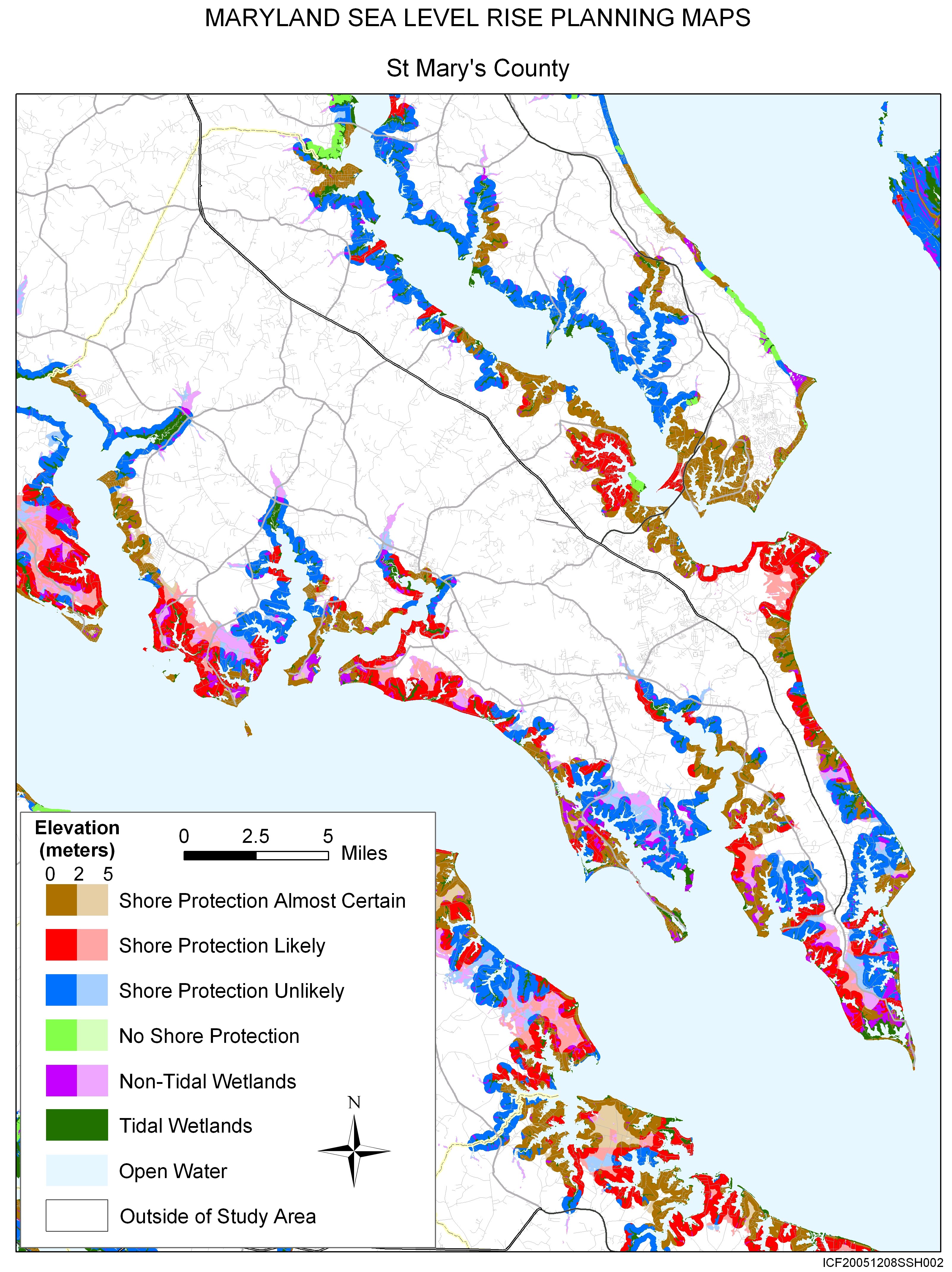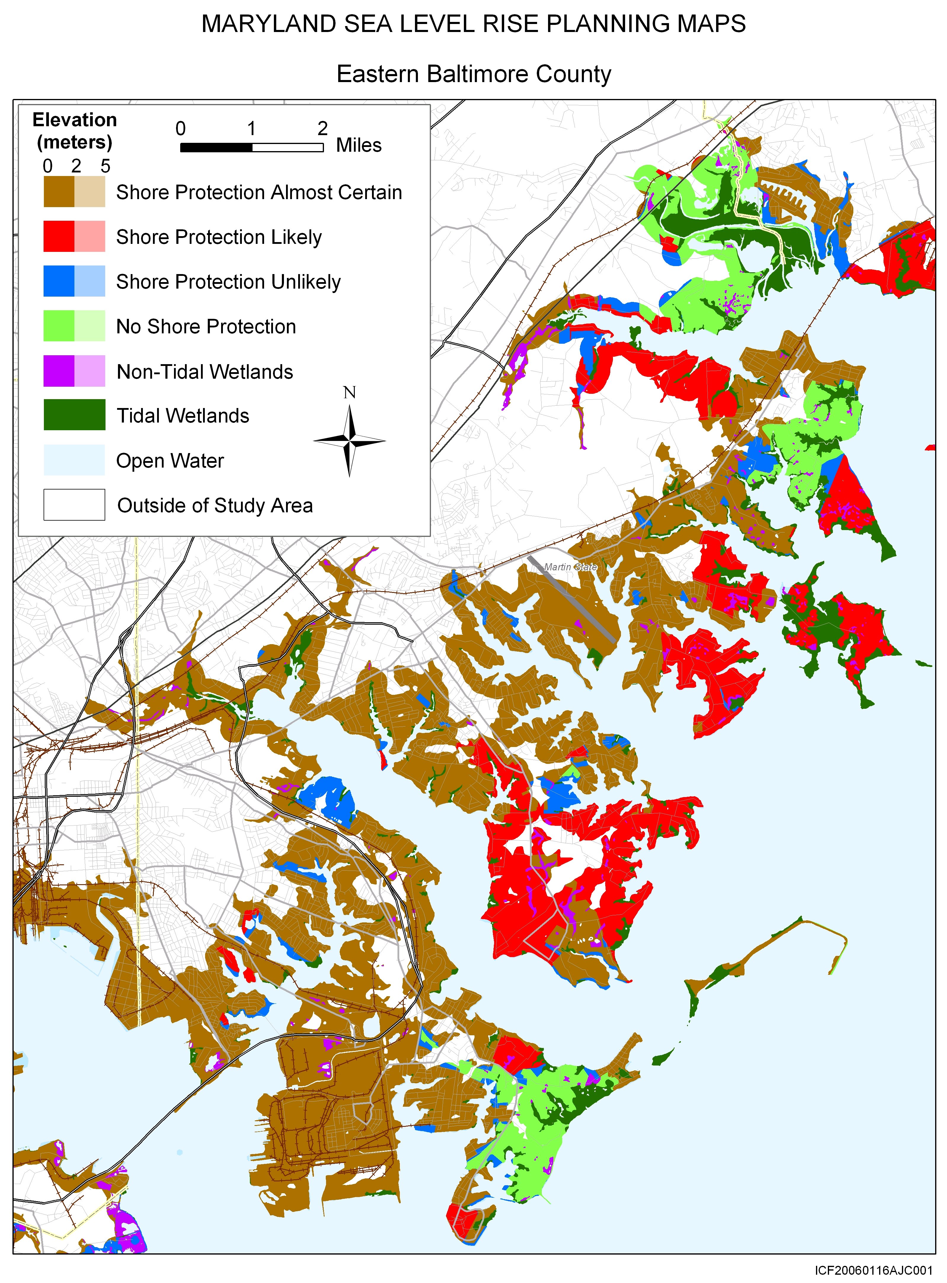 A $2 million effort to map the likelihood of shore protection as sea level rises is summarized in a new article entitled "State and local governments plan for development of most land vulnerable to rising sea level along the U.S. Atlantic Coast." The maps divide coastal low lands into four categories: developed (shore protection almost certain), intermediate (shore protection likely), undeveloped (shore protection unlikely), and conservation (no shore protection). The western shore of Chesapeake Bay is largely developed with shore protection almost certain, except for several military installations and parts of Calvert County, where clff regulations prohibit shore protection to preserve habitat for endangered species--even at the price of homes having to be lost or relocated. The Eastern shore and most tributaries to the bay are more lightly developed. Because of the state's Critical Areas Act, 90% of the undeveloped areas will have no more than 1 home per 20 acres, making shore protection unlikely. For further details, please see the report by Nuckols et al. or the summary of findings for Maryland.