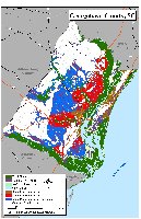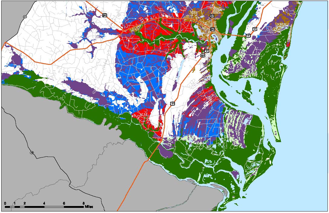 Coastal cities such as Charleston, Beaufort, and Myrtle Beach would almost certainly be protected--at least for the first meter or two of sea level rise. Shore protection has been authorized for the highly developed Grand Strand. Many of the developed barrier islands are privately owned with no public access and would be ineligible for federal funding, but the owners have spend their own money for beach nourishment on some of those islands. Inland from the ocean, there are large areas of conservation lands, especially between Charleston and the North Carolina border. Athough there are no immediate prospects for developing the large area of private lands, neither local zoning nor state law would prevent those areas from eventually becoming developed. For further details, see the sea level rise planning study by Matheny et al.